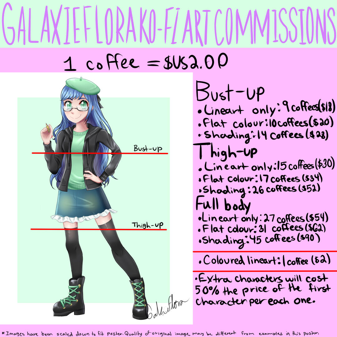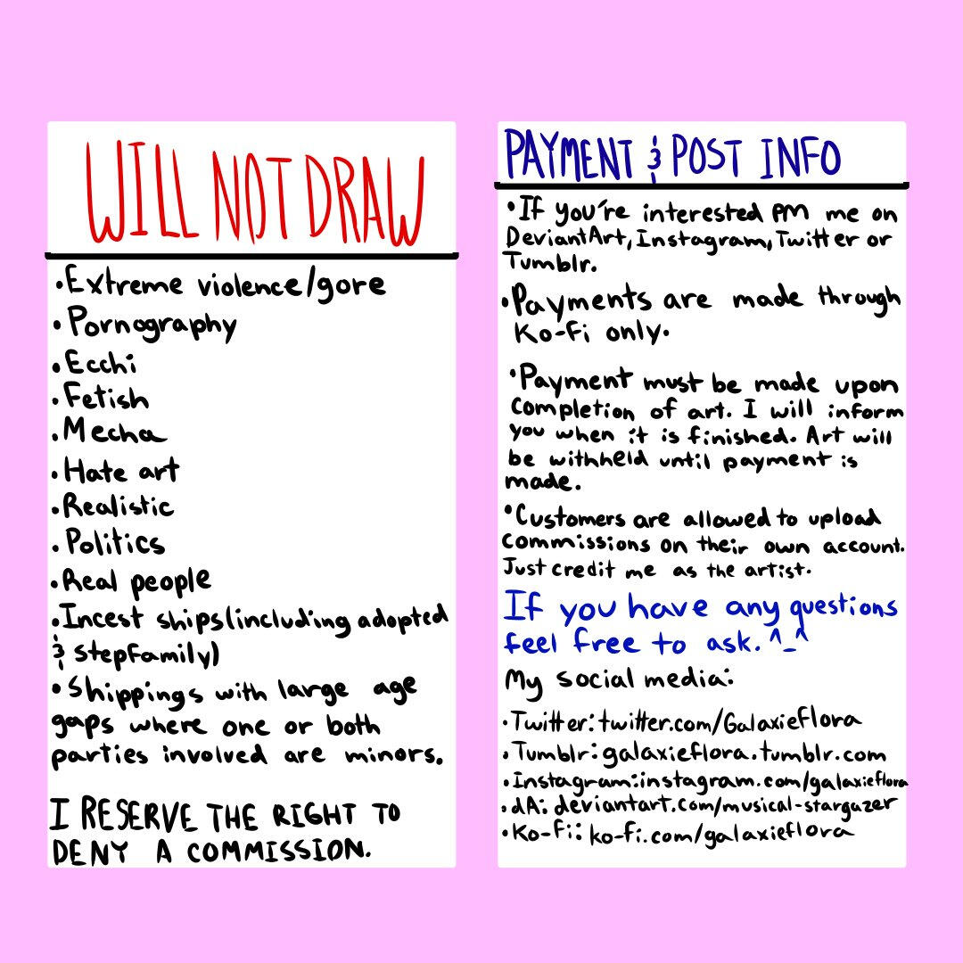 As of 2022 April 18, commissions are open.Note that I both have a part-time job and go to college, so commissions might take some time. Please take this into consideration. If you ask for updates, I'll be more than happy to give them.They're paid through Ko-Fi only. My Ko-Fi is linked below (as well as my other social media.)